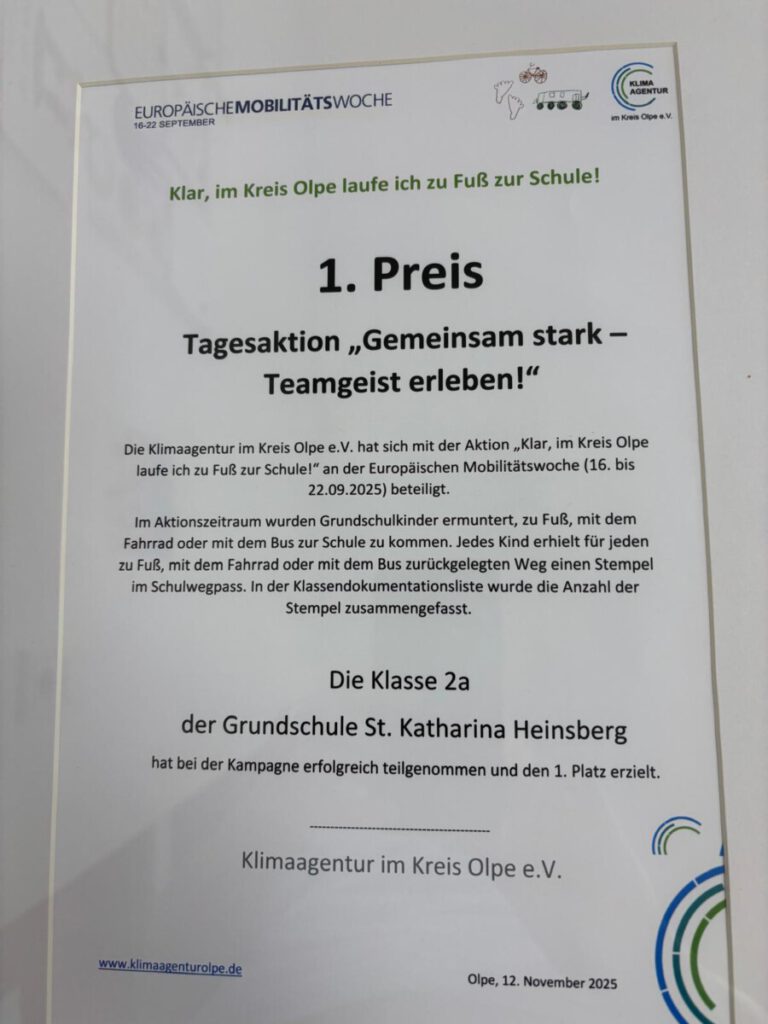Im Rahmen der Europäischen Mobilitätswoche unter dem Motto „Klar, im Kreis Olpe laufe ich zu Fuß zur Schule!“ beteiligte sich unsere Schule im Aktionszeitraum vom 16. bis 19. September 2025 an der Aktion. Ziel der Kampagne war es, Grundschulkinder zu motivieren, ihren Schulweg möglichst umweltfreundlich zurückzulegen – zu Fuß, mit dem Fahrrad oder mit dem Bus.