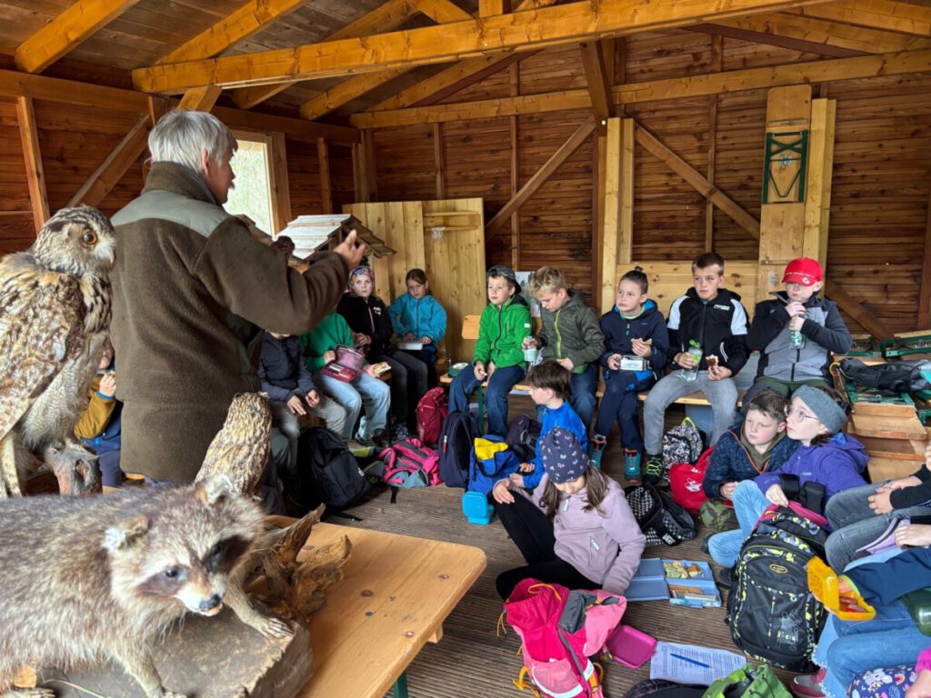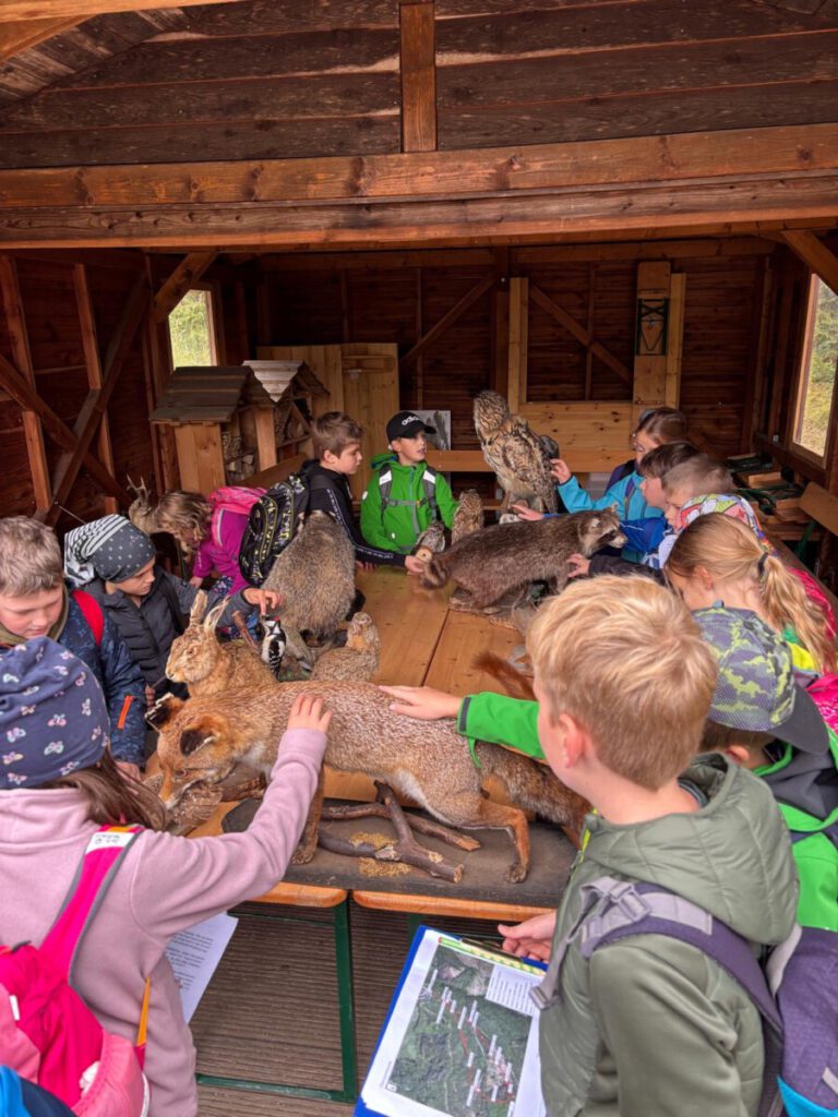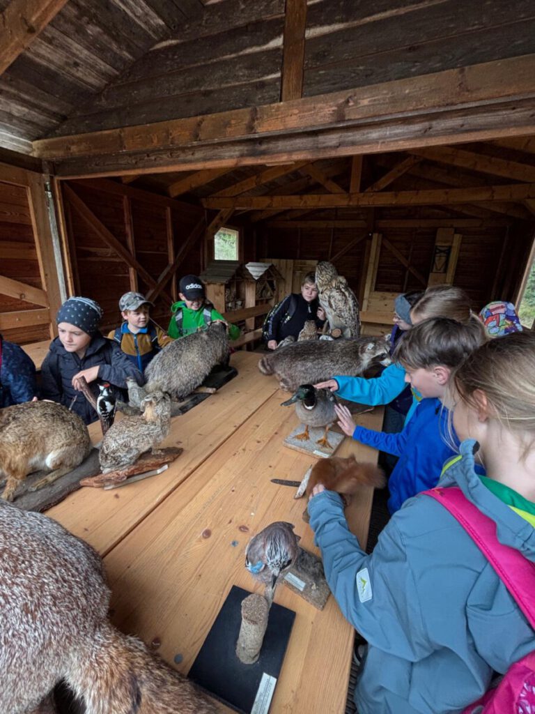Eine Station hat vielen von uns besonders gefallen, die Rollende Waldschule. Insgesamt haben wir 10 Tierpräparate vorgestellt bekommen und durften sie sogar vorsichtig streicheln. Das Wildschwein war wirklich sehr groß! Wir haben vieles über die Tiere erfahren, und dabei durften wir unser Frühstück in der Schutzhütte genießen.